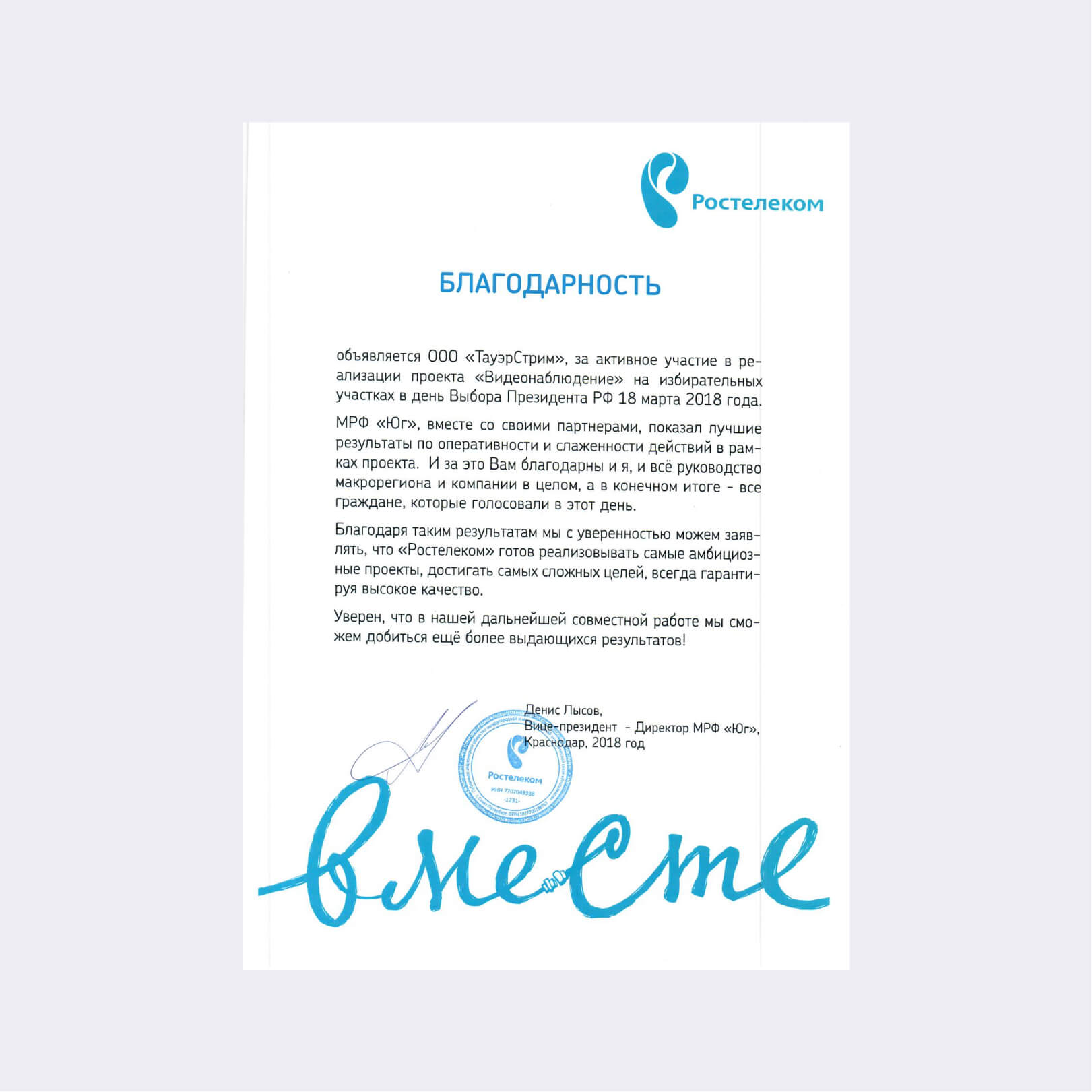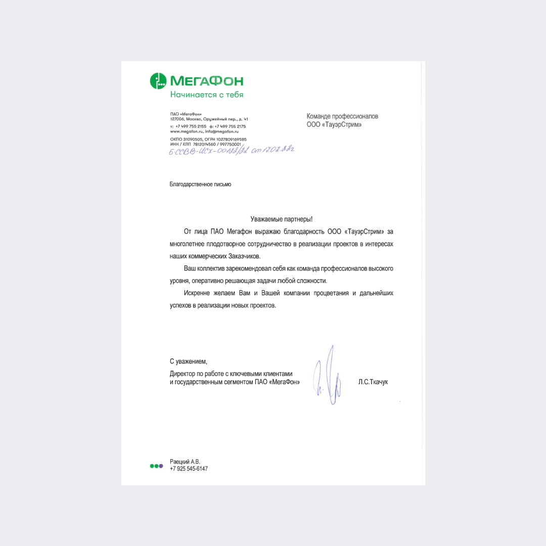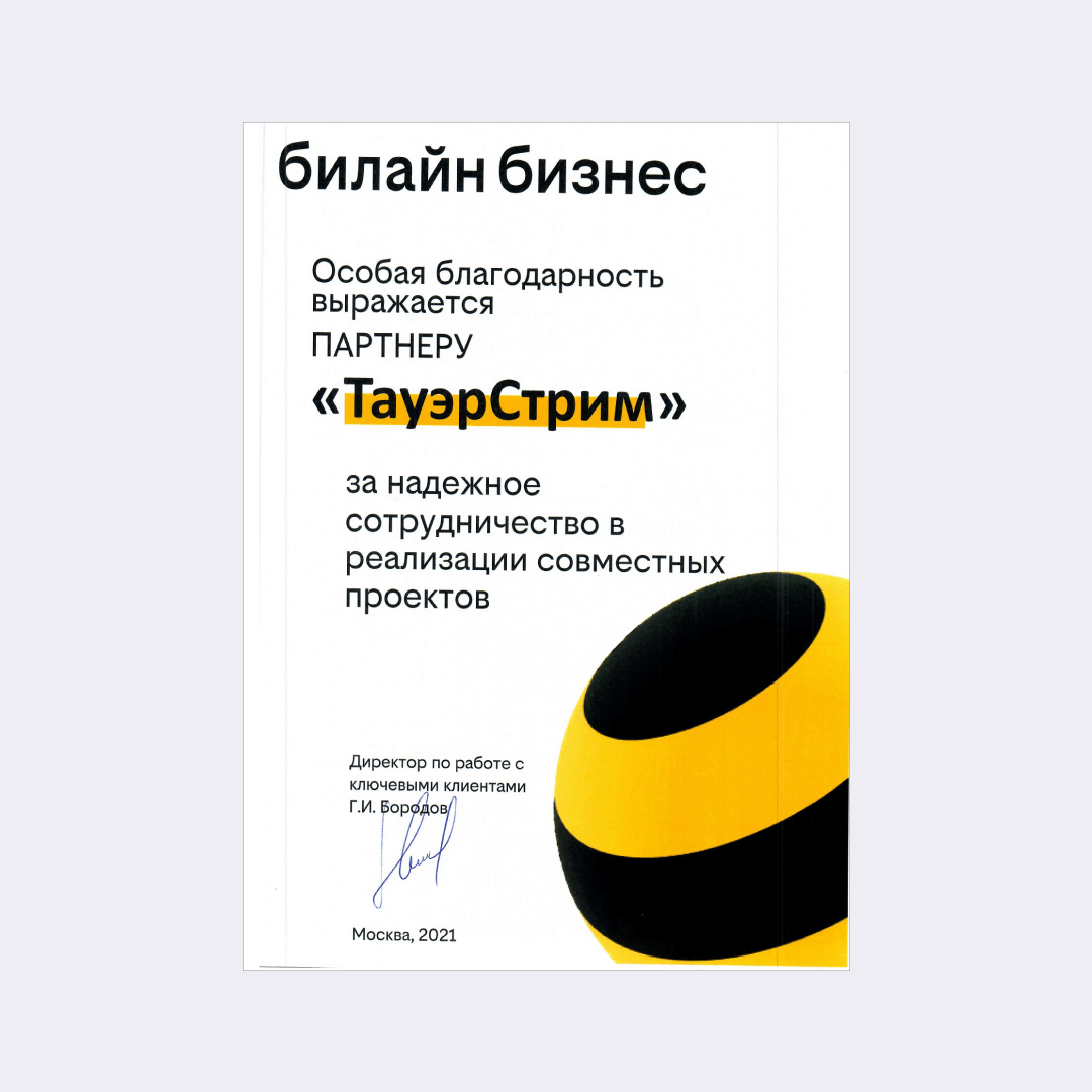 Выражаю особую благодарность от руководства и всего коллектива компании Билайн Бизнес и от себя лично нашему партнеру ТауэрСтрим, за надежное и плодотворное сотрудничество в реализации совместно реализованных проектов.