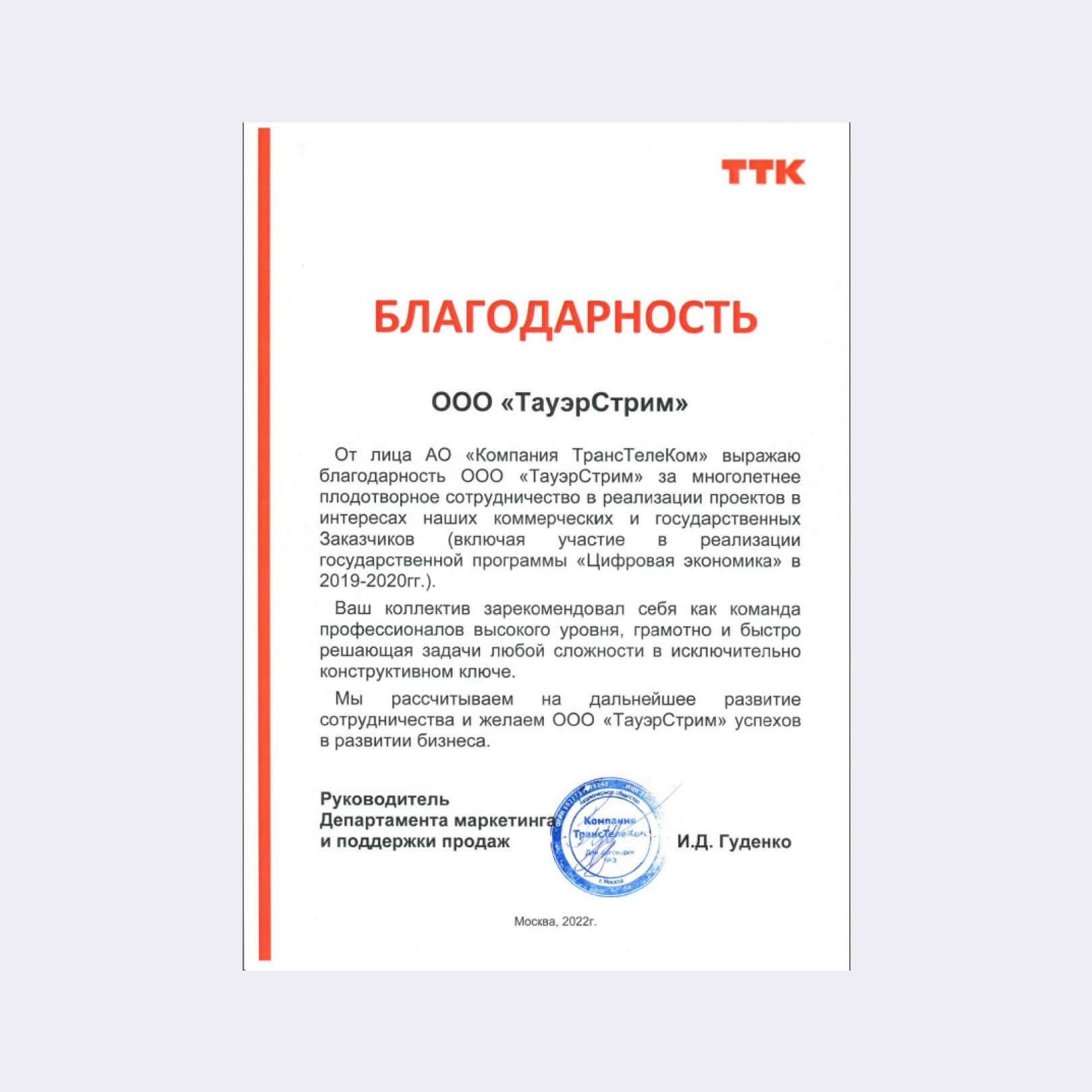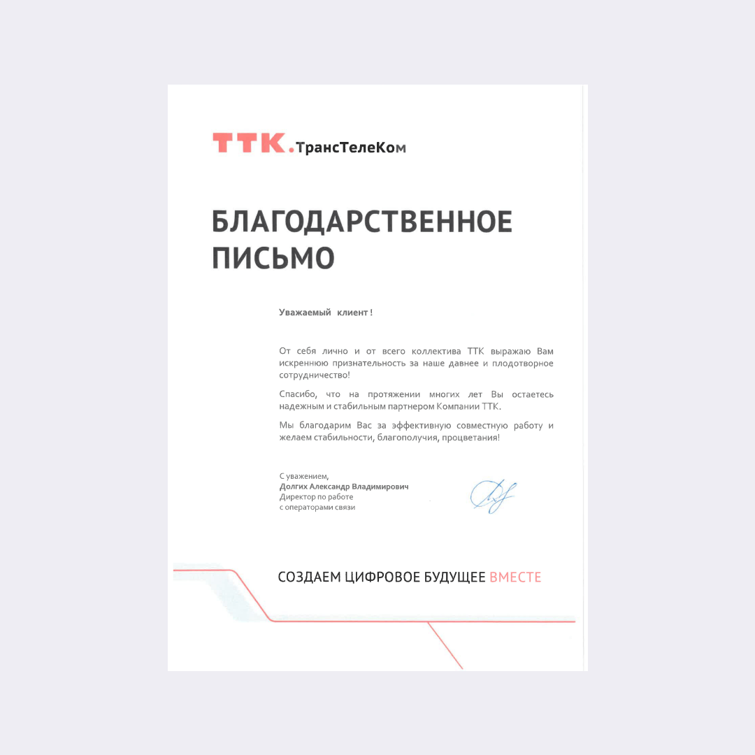 От себя лично и от всего коллектива ТТК выражаю Вам искреннюю признательность за наше давнее и плодотворное сотрудничество. Спасибо, что на протяжении многих лет Вы остаетесь надежным и стабильным партнером Компании ТТК.
