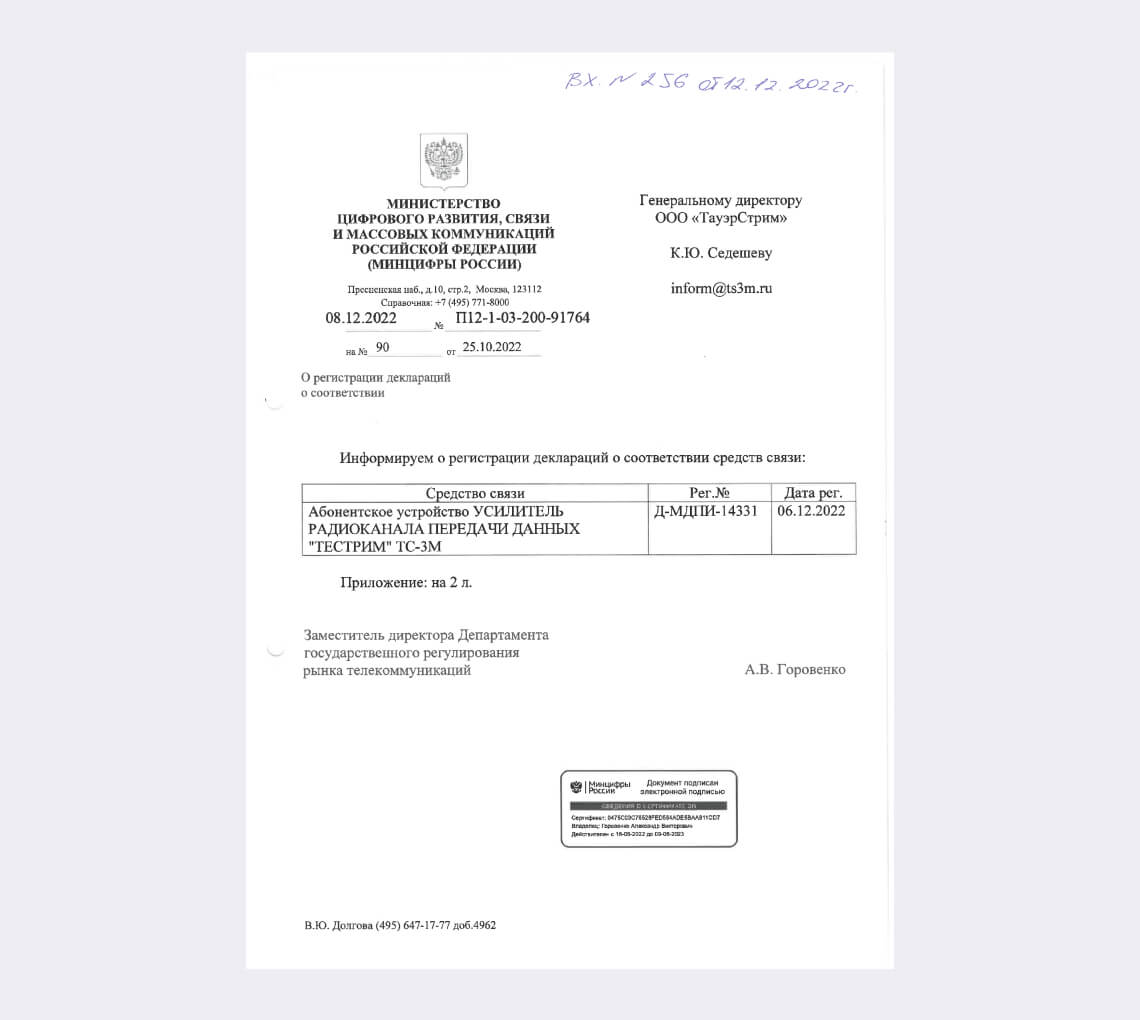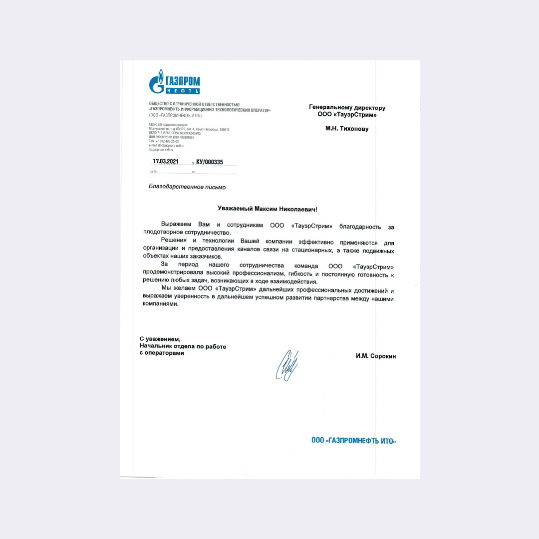 Выражаем благодарность за плодотворное сотрудничество. Решения и технологии Вашей компании эффективно применяются для организации и представления каналов связи на стационарных, а так же подвижных объектах наших заказчиков.